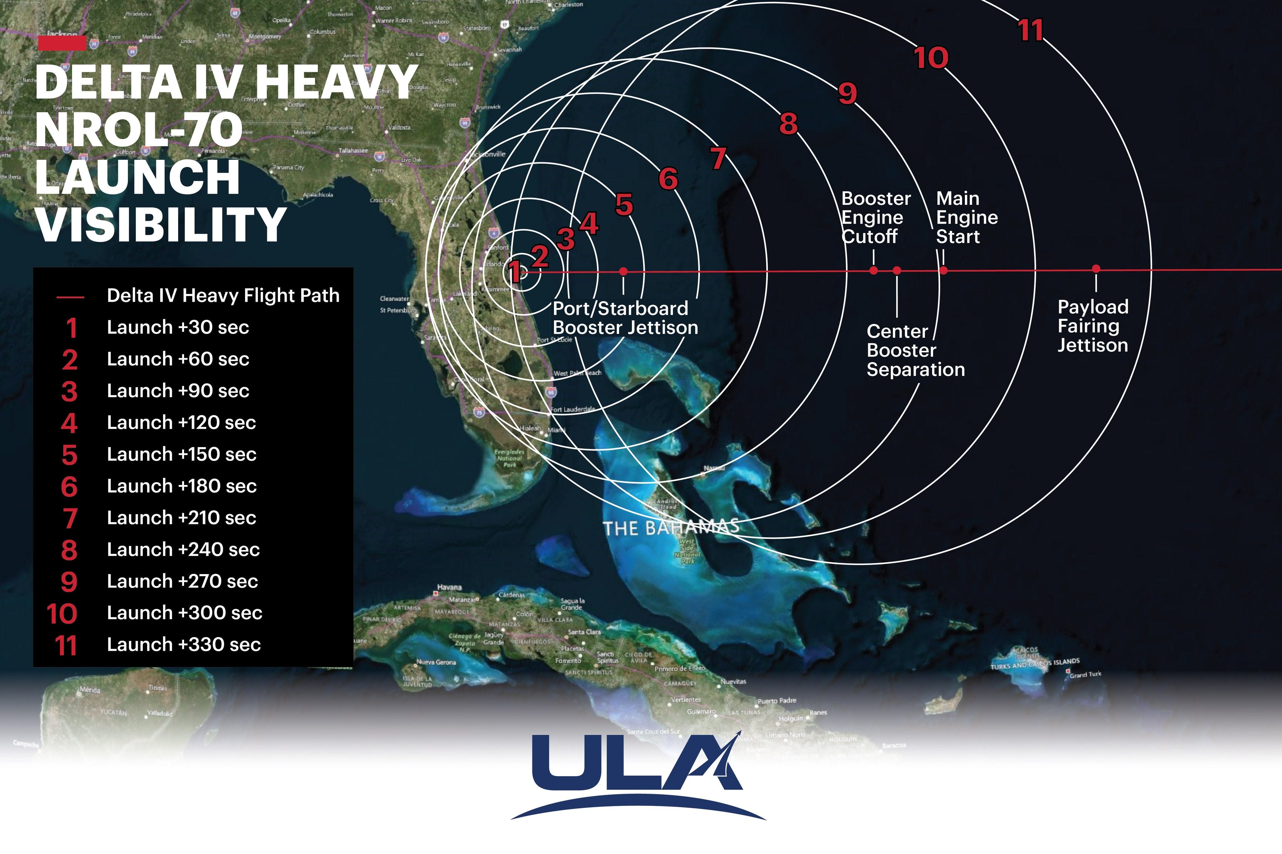 ULA telah menyediakan grafik bermanfaat (lihat di atas) yang menunjukkan jalur penerbangan dan visibilitas peluncuran Delta IV Heavy: